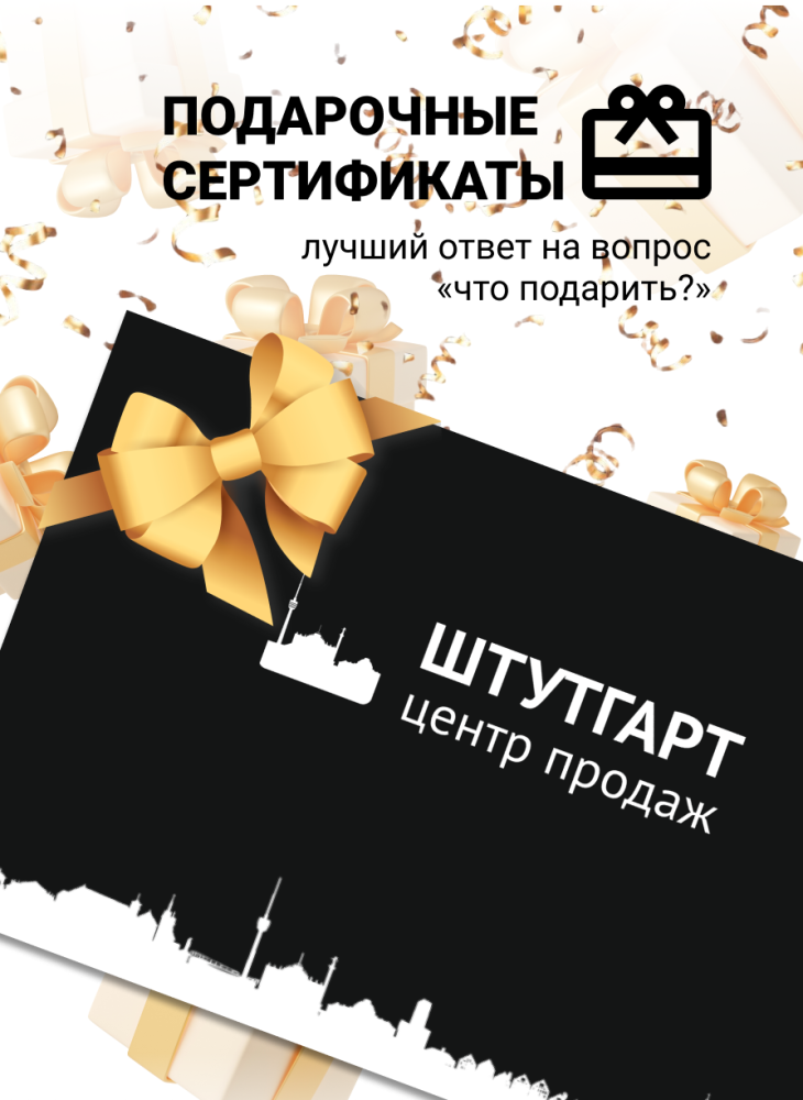 Не знаете, что подарить? Подарите выбор — подарочные сертификаты «Штутгарт центр» на любую продукцию, представленную на нашем сайте! Любой хозяин будет счастлив получить такой подарок.